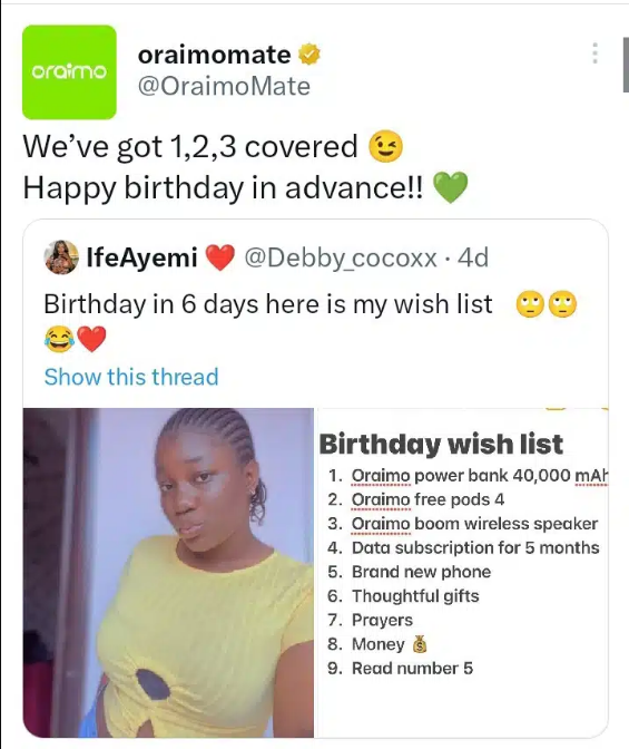 A lucky lady will receive a new Oraimo 40k mAh power bank, earbuds, and wireless speaker after publicly sharing her birthday wishlist and receiving a response from Oraimo.