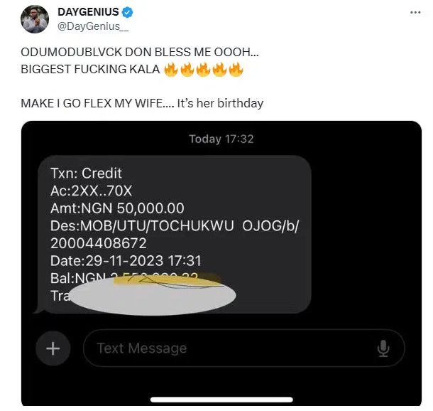 A Nigerian man has taken to social media to thank famed rapper Odumodublvck for gifting him 50,000 naira on the same day as his wife’s birthday.