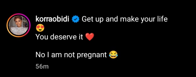 Reacting, Korra Obidi shuts down the pregnancy rumors with her latest post on Instagram.