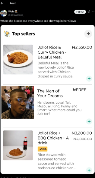 He wrote, “When she blocks me everywhere, so I show up in her Glovo.”