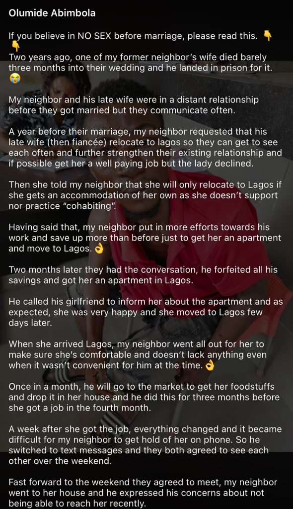 The account, shared on Facebook by Olumide Abimbola, has triggered extensive discussions across social media.