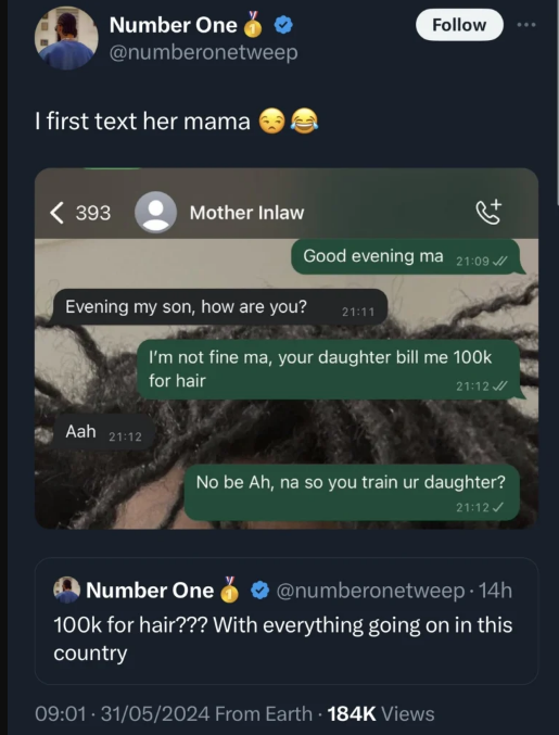 @Zee_nab123 stated: “Seems like he married into a family with expensive taste. But confronting the mother-in-law? That’s a bold move that could either end in resolution or a family feud.”