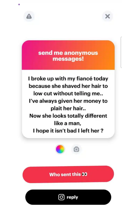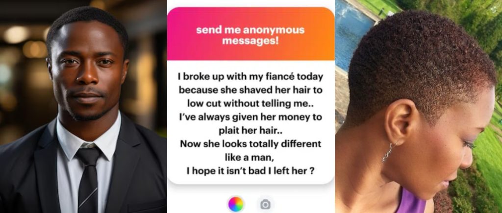 “I broke up with my fiancé today because she shaved her hair to low cut without telling me.. I’ve always given her money to plait her hair.. Now she looks totally different like aman, I hope it isn’t bad I left her ?”