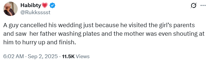 The viral tweet read: “A guy cancelled his wedding just because he visited the girl’s parents and saw her father washing plates, with the mother even shouting at him to finish quickly.”
