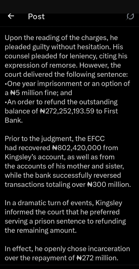 Following his plea, the court ordered Kingsley to refund the outstanding sum of ₦272,252,193.59 to First Bank. Prior to the judgment, the EFCC had already recovered ₦802.42 million from Kingsley’s accounts and those linked to his relatives, while an additional ₦300 million was retrieved through transfer reversals.