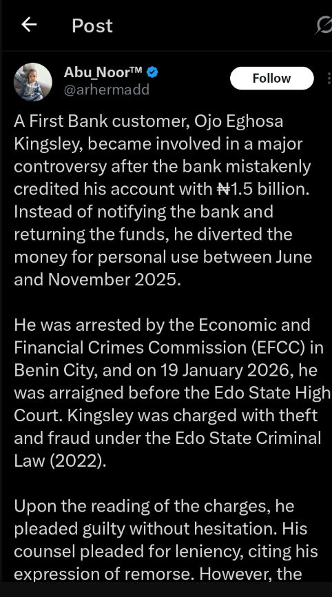 The incident was shared on X (formerly Twitter) by user @arhermadd, who identified the man as Ogo Ehosa Kingsley. According to the post, Kingsley allegedly diverted the funds for personal use after the erroneous credit hit his account between June and November 2025.