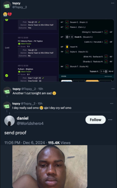 • In a heartfelt series of posts @Topzy__2 opened up about his challenges, explaining how one game spoiled his betting tickets for two consecutive nights.