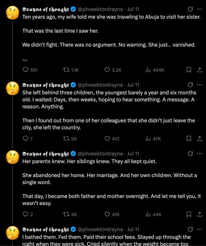 A Nigerian man has stirred widespread reactions online after revealing the heartbreaking story of how his wife disappeared for ten years, only to return and request custody of the children she left behind.