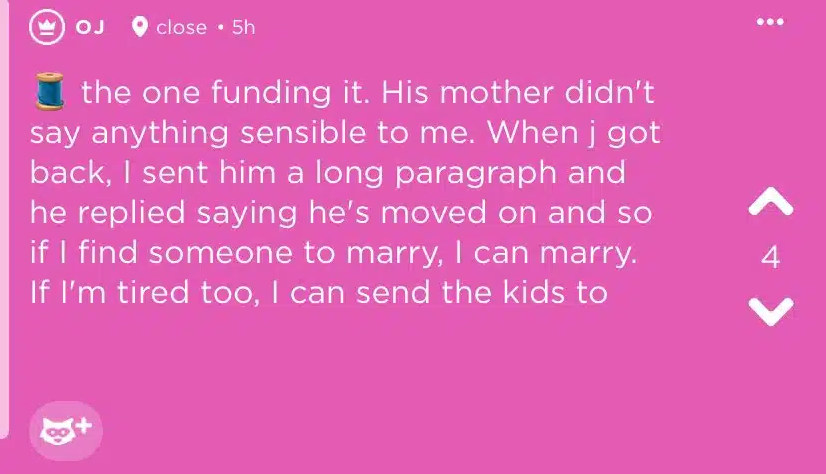 The woman explained that she had to take serious steps when he told her to marry someone else and send their kids to his mom.