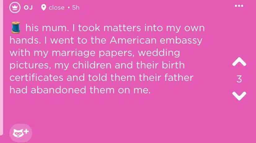“My ex husband left to abroad to study for 2 years. When he left, we had 3 children. Because he was going to study and not work, I decided not to burden him with money and raise the kids with my money solely until he begins to work or come back home. After the 2 years, he decided to stay and work. He sent money 4 times and started giving excuses. I wasn’t understanding because how was he expecting me to feed and cater for 3 children alone. This went on and on and after constant arguments, he’d send a meager amount. Then he stopped picking my calls and texts. I went to report him to his people in the village and I realised there was a building project going on in his compound. I suspected he was the one funding it. His mother didn’t say anything sensible to me. When j got back, I sent him a long paragraph and he replied saying he’s moved on and so if I find someone to marry, I can marry. If I’m tired too, I can send the kids to his mum. I took matters into my own hands. I went to the American embassy with my marriage papers, wedding pictures, my children and their birth A certificates and told them their father had abandoned them on me Unfortunately for him, during his visa interview, he said he was single with no children. He had also overstayed and didnt have papers. They deported him back sharp.