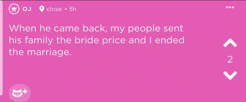When he came back, my people sent his family the bride price and i ended the marriage.
