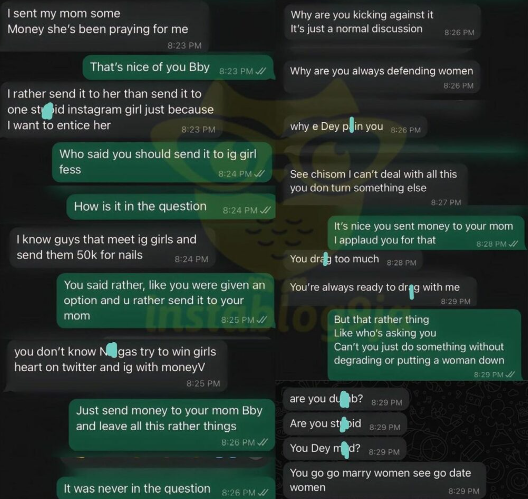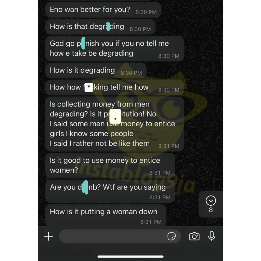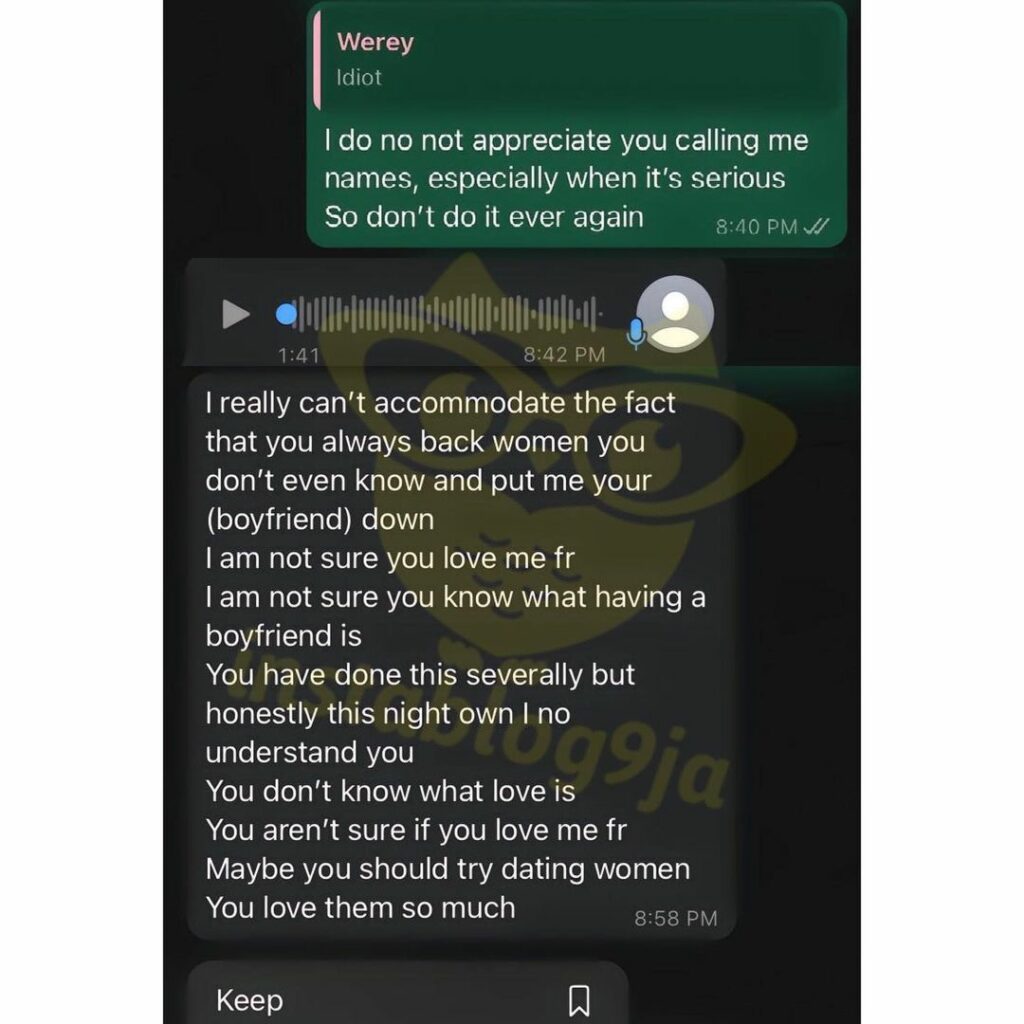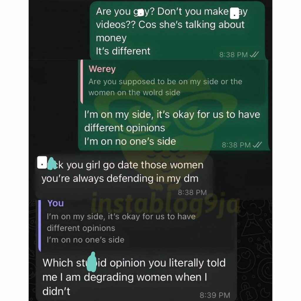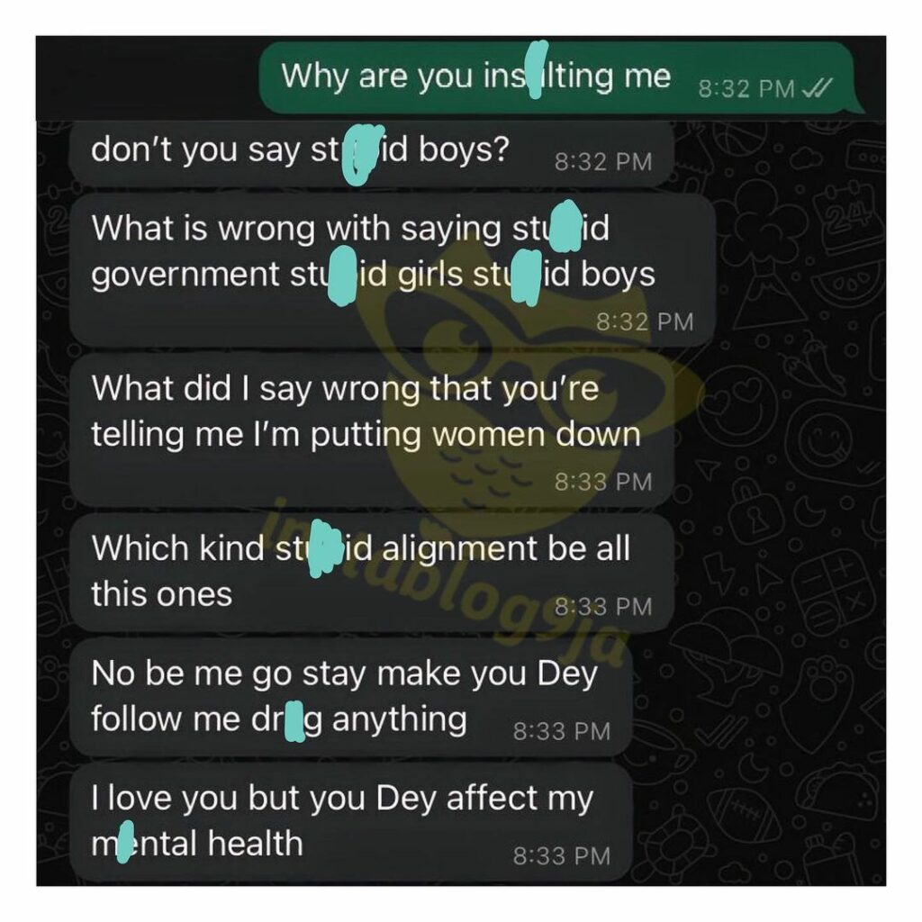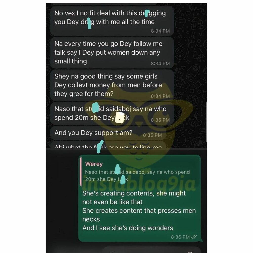 Lady leaks chat after she was dumped by her partner for defending controversial influencer Saida Boj.