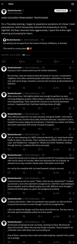 His story has sparked widespread concern on social media, with many Nigerians expressing shock and calling on authorities to act quickly to combat the growing threat of organ trafficking.