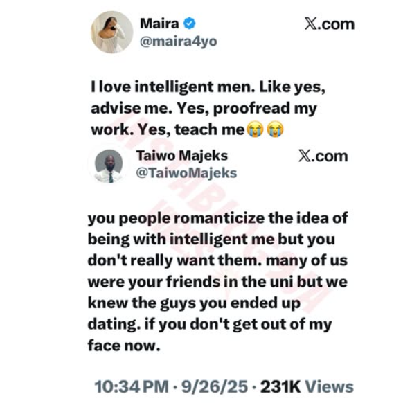 Her admiration for intellectual partners quickly drew a sharp response from another user, Taiwo Majeks (@TaiwoMajeks), who challenged the sincerity of such claims. He wrote: “You people romanticize the idea of being with intelligent men but you don’t really want them. Many of us were your friends in uni but we knew the guys you ended up dating. If you don’t get out of my face now.”