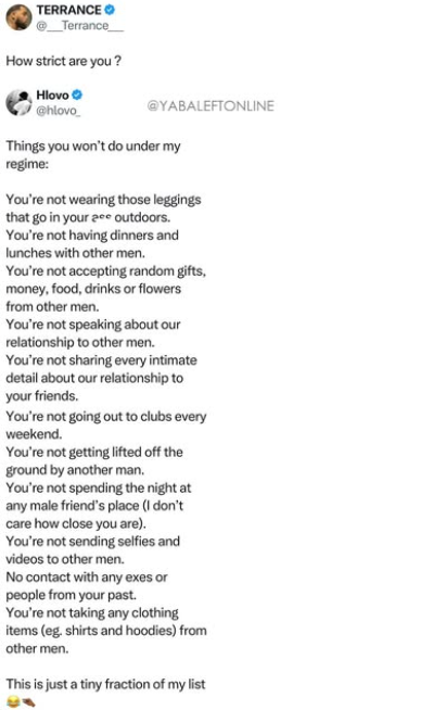 The post began when a user named Terrance asked, “How strict are you?” prompting another user, Hlovo, to reply with a detailed list titled “Things you won’t do under my regime.”
