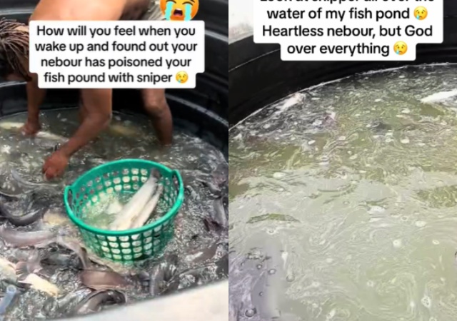 A Nigerian businessman is devastated and heartbroken as woke up to dead fishes in his catfish pond after his envious neighbour poisoned it with sniper.