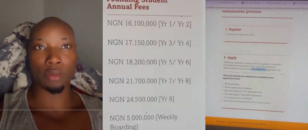 “I’m looking at this secondary school. Their school fees is ₦24 million a year. If you’re a boarding student, that’s an additional ₦7 million. And if you want to apply, application fee is ₦2 million,” he said in the video, showing his astonished expression.