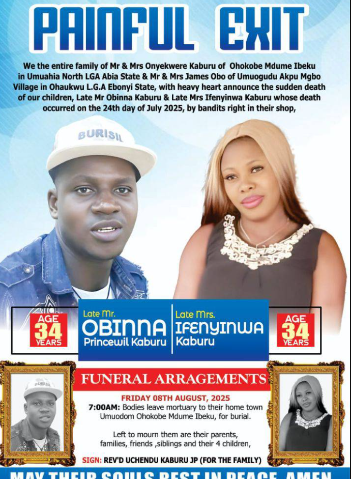 The couple, both aged 34, were among seven people shot dead on July 24, 2025, in Arondizuogu, Ideato Local Government Area. The victims included shop owners, customers, and passersby caught in the attack.
