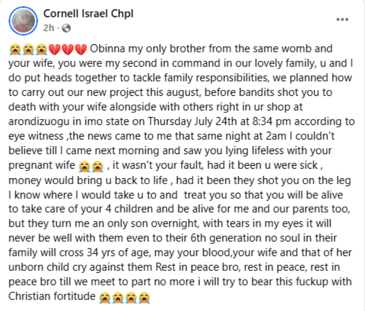 “Obinna, my only brother from the same womb and your wife, you were my second in command in our lovely family, u and I do put heads together to tackle family responsibilities, we planned how to carry out our new project this August before bandits shot you to d3ath with your wife alongside with others right in your shop at Arondizuogu in Imo state on Thursday July 24th at 8:34 pm, according to eye witness,” he wrote.