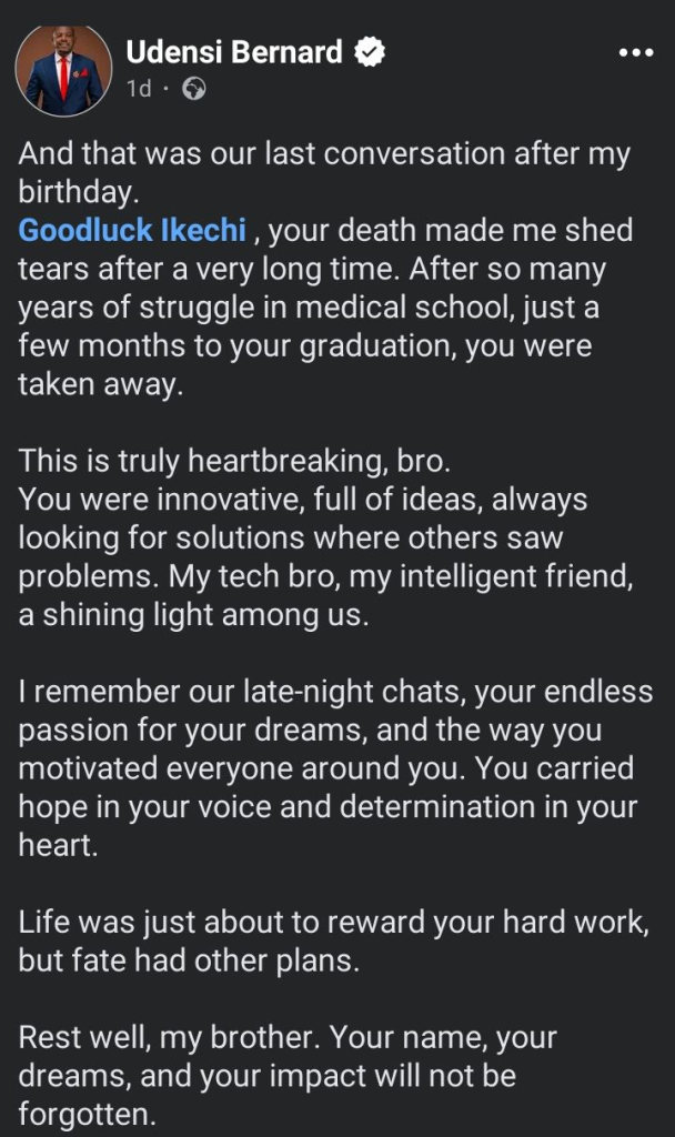 A man has written an emotional tribute to his late friend, Goodluck Ikechi, who sadly passed away just months before completing his medical degree.