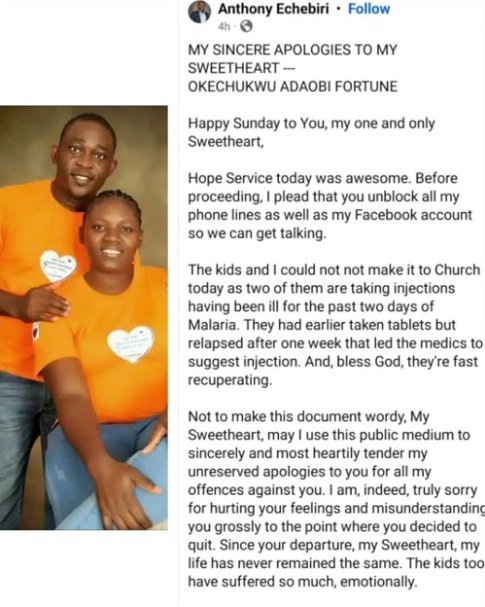 A Nigerian man has publicly apologized to his wife. Anthony Okechukwu Echebiri previously accused his wife, Okechukwu Adaobi Fortune, of cheating after they had been apart for two years.