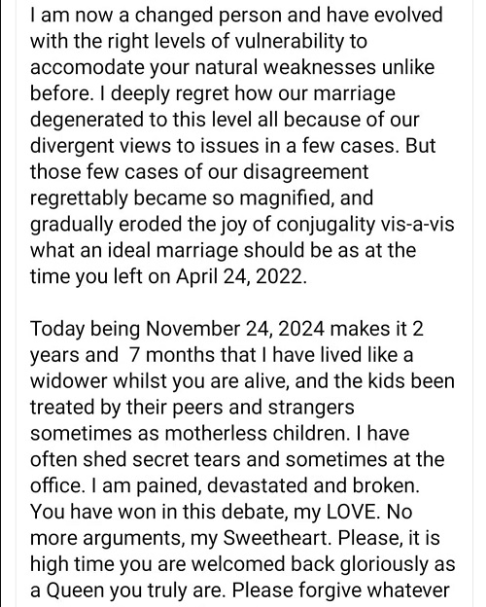 But those few cases of our disagreement regrettably became so magnified, and gradually eroded the joy of conjugality vis-a-vis what an ideal marriage should be as at the time you left on April 24, 2022. Today being November 24, 2024 makes it 2 years and 7 months that I have lived like a widower whilst you are alive, and the kids been treated by their peers and strangers sometimes as motherless children.