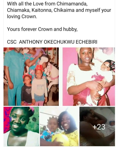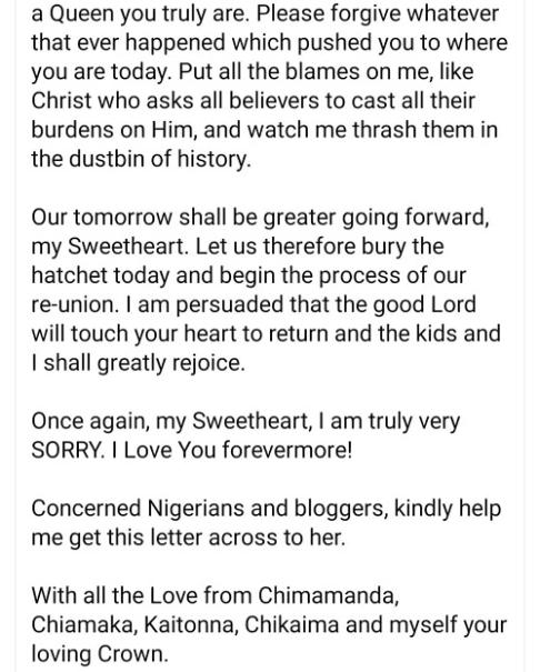 “Concerned Nigerians and bloggers, kindly help me get this letter across to her. With all the Love from Chimamanda, Chiamaka, Kaitonna, Chikaima and myself your loving Crown. Yours forever Crown and hubby, CSC ANTHONY OKECHUKWU ECHEBIRI”