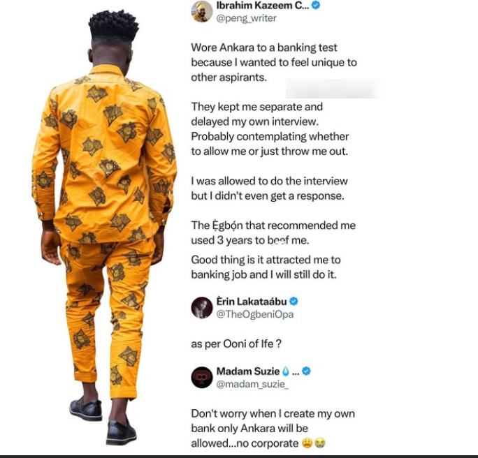 A Nigerian man, Ibrahim Kazeem, has shared his unusual experience after choosing to wear an Ankara outfit to a banking test in a bid to stand out from other candidates.