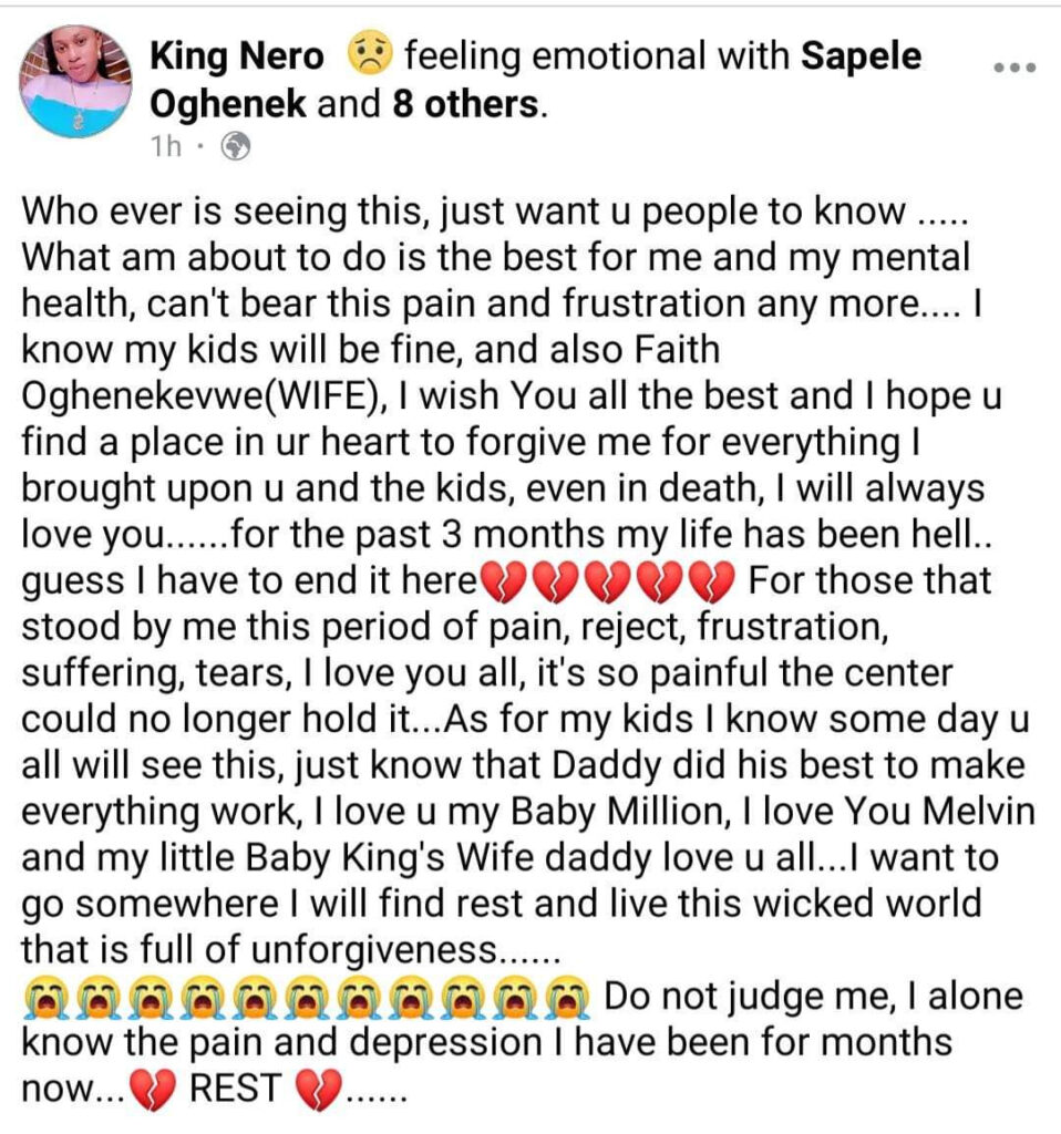 Social media followers are now calling on his wife to put their differences aside and seek out her husband to prevent him from commiting suicide.