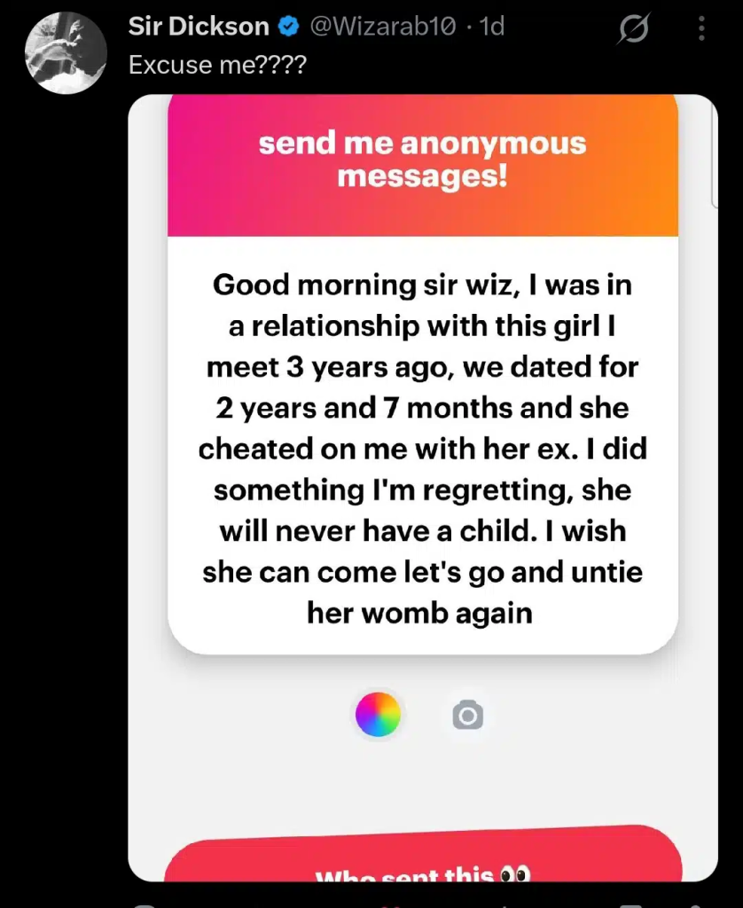 “Good morning Sir Wiz, I was in a relationship with this girl I met 3 years ago. We dated for 2 years and 7 months, but she cheated on me with her ex. I did something I regret. She will never have a child. I wish she would come, and we could untie her womb again.”
