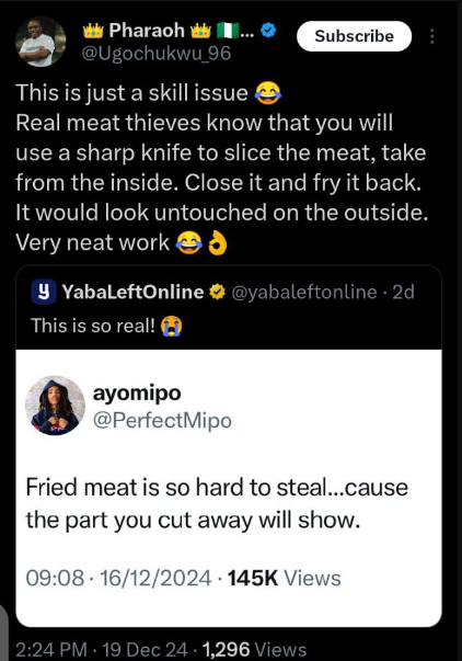 Earlier, another user, Ayomipo, had complained about the challenges of stealing fried meat.