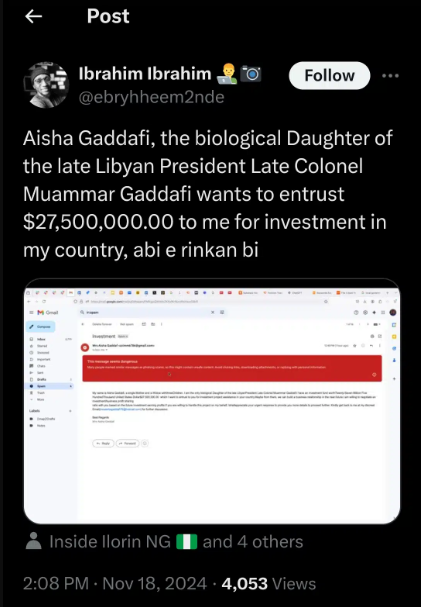 He wrote: “Aisha Gaddafi, the biological daughter of the late Libyan President, Colonel Muammar Gaddafi, wants to entrust $27,500,000.00 to me for investment in my country. Abi, e rinkan bi?”