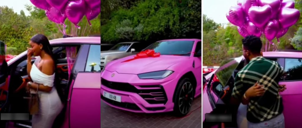 A Nigerian man, IK Okoronkwo, has captured the internet’s attention after presenting his South African wife, Beverly Tlhako, with a luxurious pink Lamborghini Urus as a push gift.