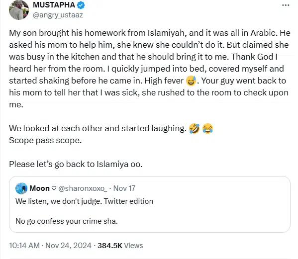 “My son brought his homework from Islamiyah, and it was all in Arabic. He asked his mom to help him, she knew she couldn’t do it. But claimed she was busy in the kitchen and that he should bring it to me. Thank God I heard her from the room. I quickly jumped into bed, covered myself and started shaking before he came in. High fever 😅. Your guy went back to his mom to tell her that I was sick, she rushed to the room to check upon me.