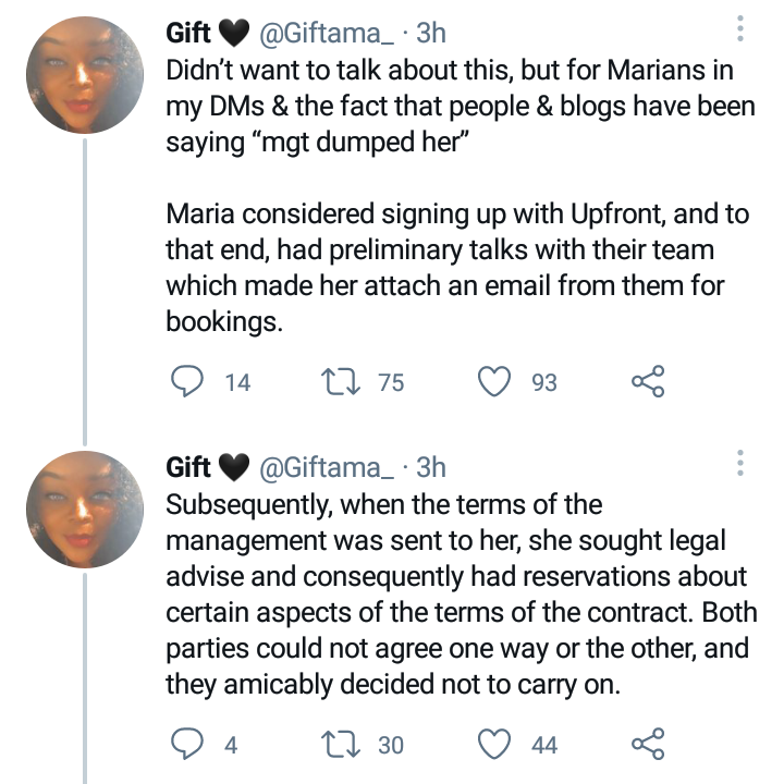 The PR team of BBNaija Season 6 star, Maria Chike have revealed that she wasn’t dumped by Upfront, the brand that was said to have signed her.