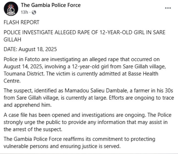 “Police in Fatoto are investigating an alleged r3pe that occurred on August 14, 2025, involving a 12-year-old girl from Sare Gillah village, Toumana District. The victim is currently admitted at Basse Health Centre,” the statement read.