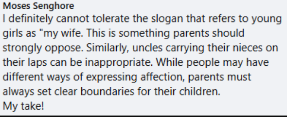 Meanwhile, several Gambian Facebook users have warned parents not to allow mature males, including family members, to call their little daughter ‘wife’.