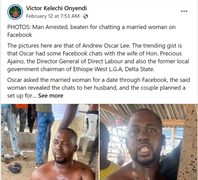 A married man identified Andrew Lee Oscar was reportedly beaten for allegedly chatting with wife of a politician in Delta State on Facebook, and also asking her out on a date.
