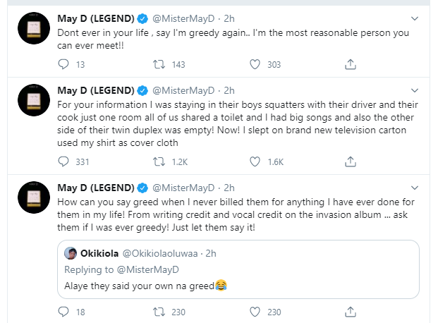 May D also revealed that he never had a bank account while with Square Records which was owned by Psquare, as he was made to share a room with their driver and cook even though their twin duplex was empty.