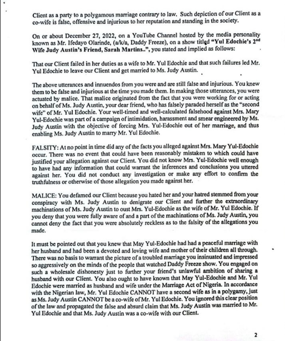 Sarah had also made strong allegations against May in an interview with media personality, Daddy Freeze. She claimed that May failed in her duties to Yul as his wife, which made him find love in the arms of her friend, Judy Austin.