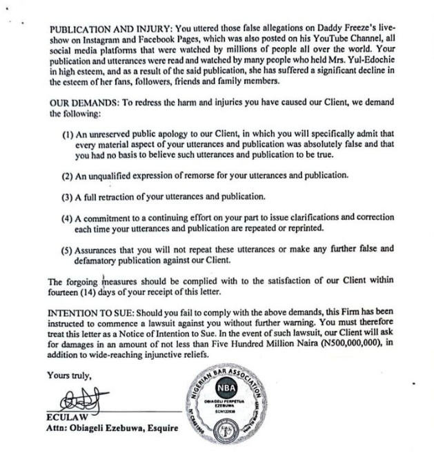 - The mother of four is seeking for a public apology, a retraction of statement and assurance that she won’t repeat the utterances.
