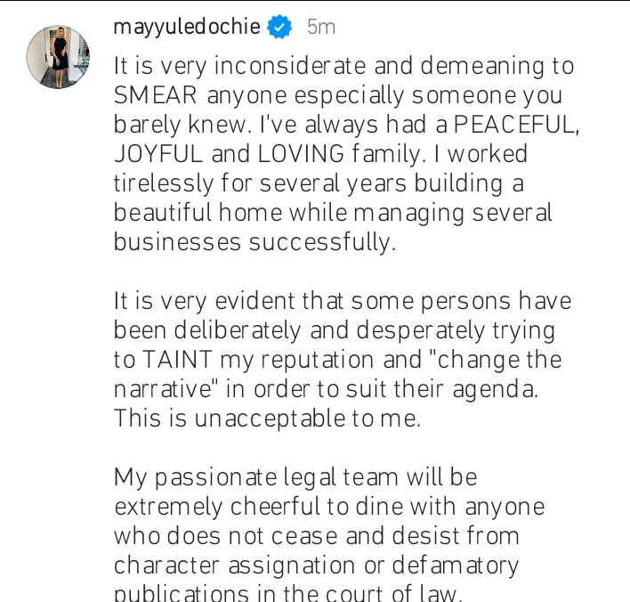 Sharing the lawsuit on her Instagram page, May stated that she has realized that some persons are out to taint her reputation and change the narrative in order to suit their agenda. May Edochie reinterated that she had a peaceful, and joyful marriage with Yul before the unfortunate happened.
