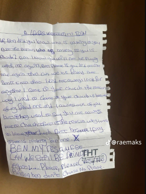 A Nigerian woman took to TikTok to share a letter she discovered in the bag of her 12-year-old sister, who was dumped by her boyfriend, Ben.