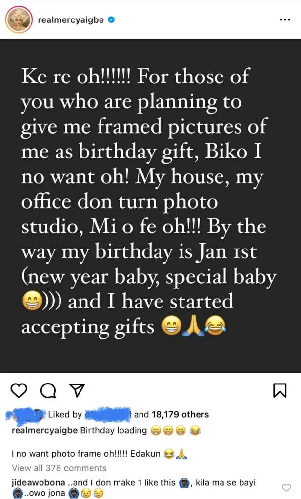 Nigerian actress and businesswoman, Mercy Aigbe has urged her fans, colleagues and followers not to gift her framed pictures.