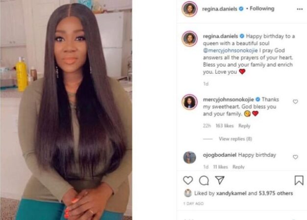 Nollywood actress Mercy Johnson, has pricelessly reacted to the lovely birthday message actress and new mum, Regina Daniels, penned to her as she turned a year older on Friday.