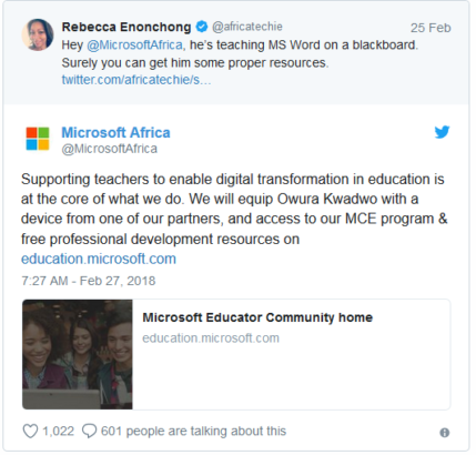 Among the hundreds of people who shared the post and helped popularize it is Rebecca Enonchong, an entrepreneur who urged Microsoft Africa on Twitter to provide Akoto with some proper devices so he can leave the chalkboard behind.