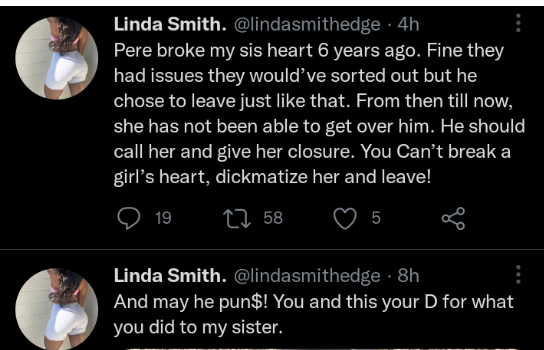 “Pere broke my sis heart 6 years ago. Fine they had issues they would’ve sorted out but he chose to leave just like that. From then till now, she has not been able to get over him. He should call her and give her closure. You Can’t break a girl’s heart, dickmatize her and leave!”