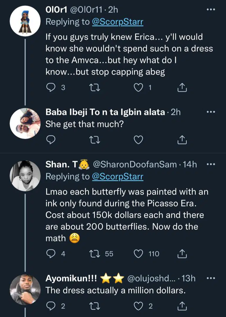 “It’s was just reconfirmed from a reliable source that awa original butterfly dress was actually $794,000 not $500,000 that I was told. Erica Nlewedim, the queen of the sky, and the ground. 🔥🔥🔥,” the fan wrote.