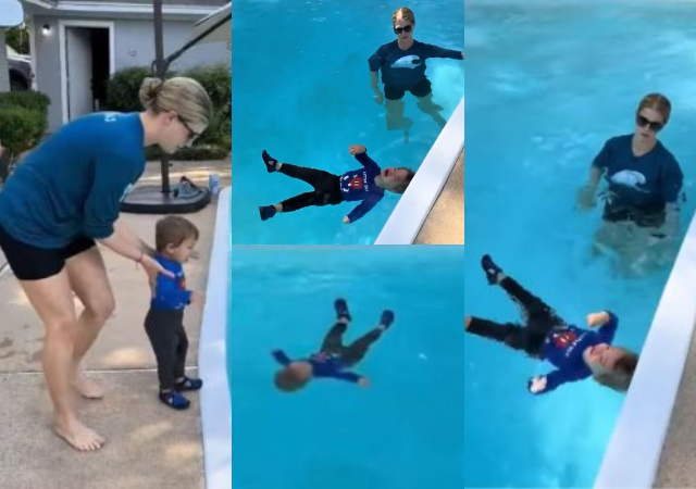 - The footage shows the child crying and looking distressed as an instructor puts them underwater and helps them learn to float.