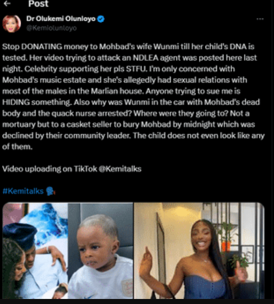 “Also why was Wunmi in the car with Mohbad’s dead body and the quack nurse arrested? Where were they going to? Not a mortuary but to a casket seller to bury Mohbad by midnight which was declined by their community leader. The child does not even look like any of them.”